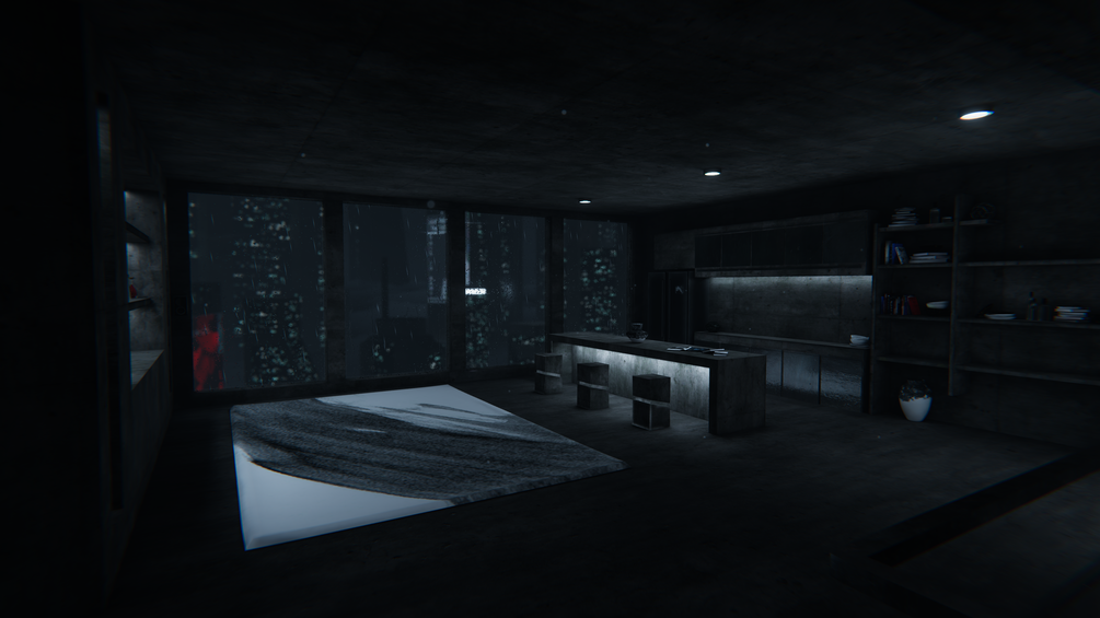 Limerence is a brutalist high-rise apartment suspended in the rain and dark clouds‚ overlooking a dystopian corporate city below․ Home to hidden comforts‚ games‚ and videoplayers․․ Even a speakeasy bar․․
